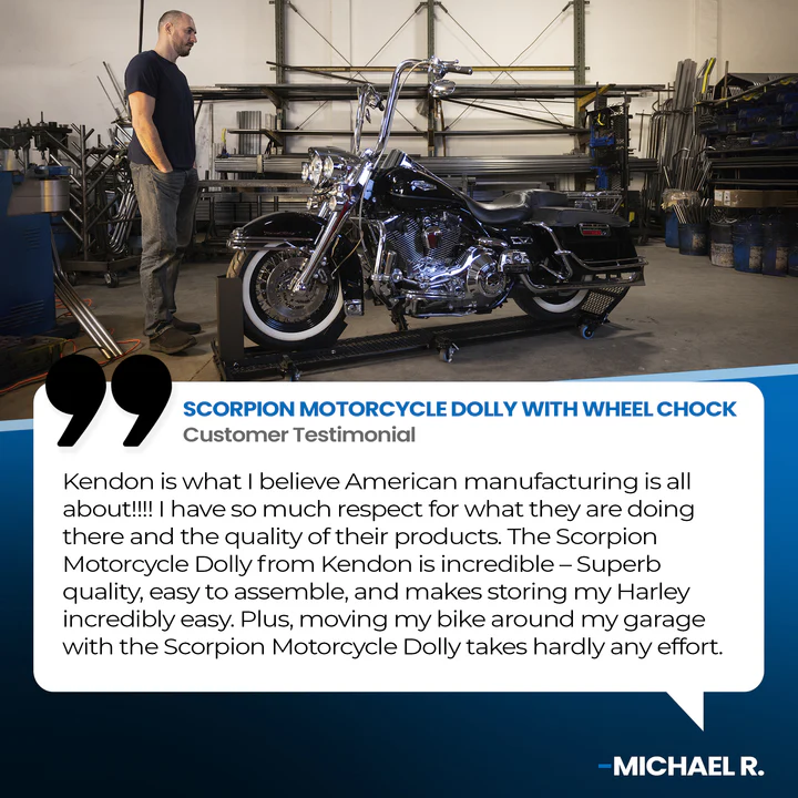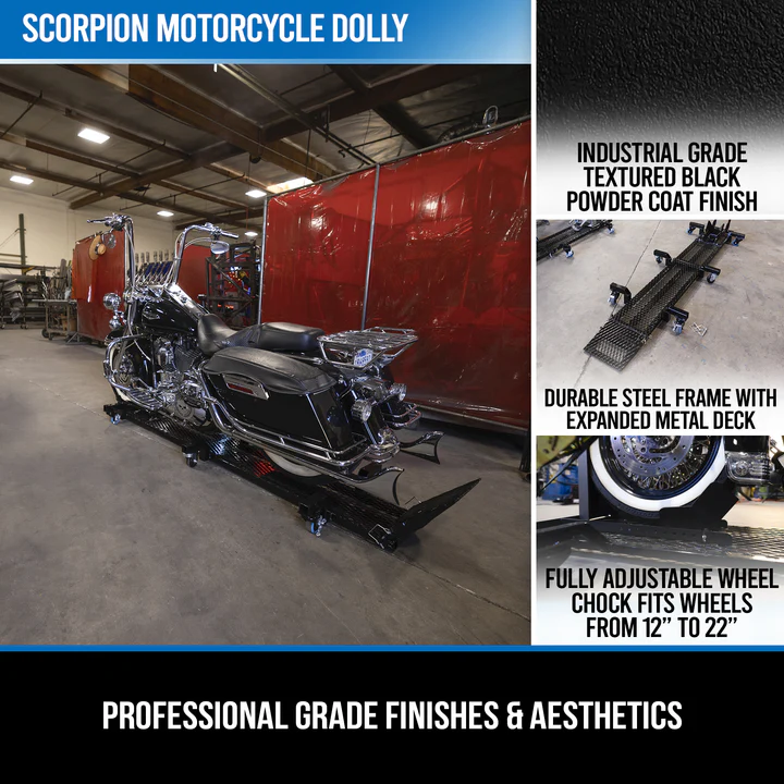 Designed with years of testing behind it, the Kendon Scorpion Motorcycle Dolly offers outstanding strength, stability, and versatility. Built to easily move or store motorcycles of all types, this folding dolly includes an adjustable wheel chock and integrated ramp for convenience and control.