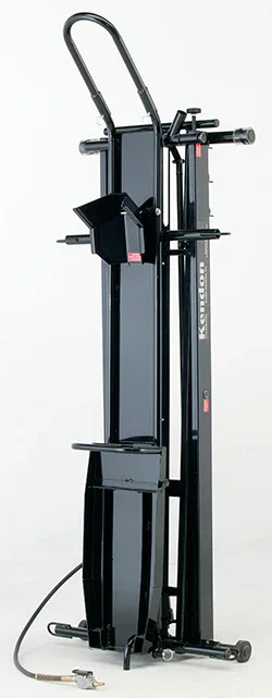 Kendon’s bike lifts feature an air-over-hydraulic jack with extruded aluminum housing for improved valving and slow, controlled descent. The lift can be used manually with the included hand lever or using a compressor. A minimum 120 psi with a 5 gallon tank air compressor is all that is required to actuate the lift. A multi-position adjustable folding wheel chock along with a five-position height lock keep your bike securely in place.