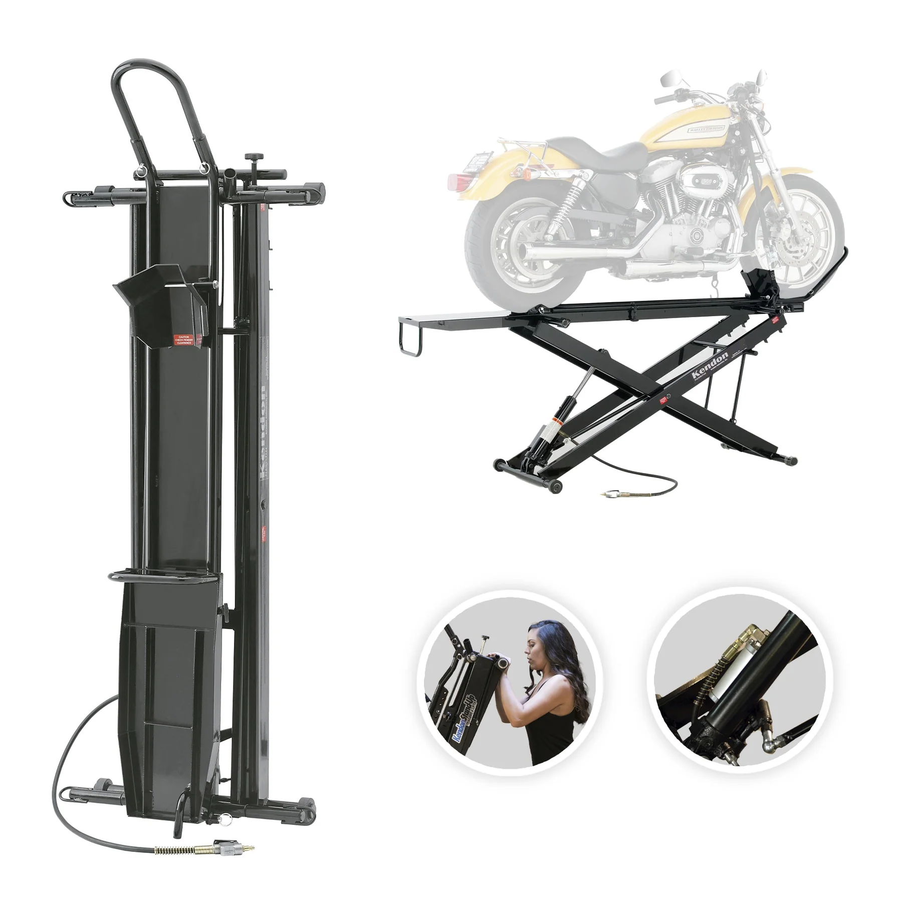 We’ve changed and added a few features on the latest Kendon folding motorcycle lifts to make them even more versatile and easier to use.  Automatic height lock, improved air/hydraulic cylinder and more. We also increased the overall stability and rigidity so that you can safely and confidently use the lift with practically any model bike.